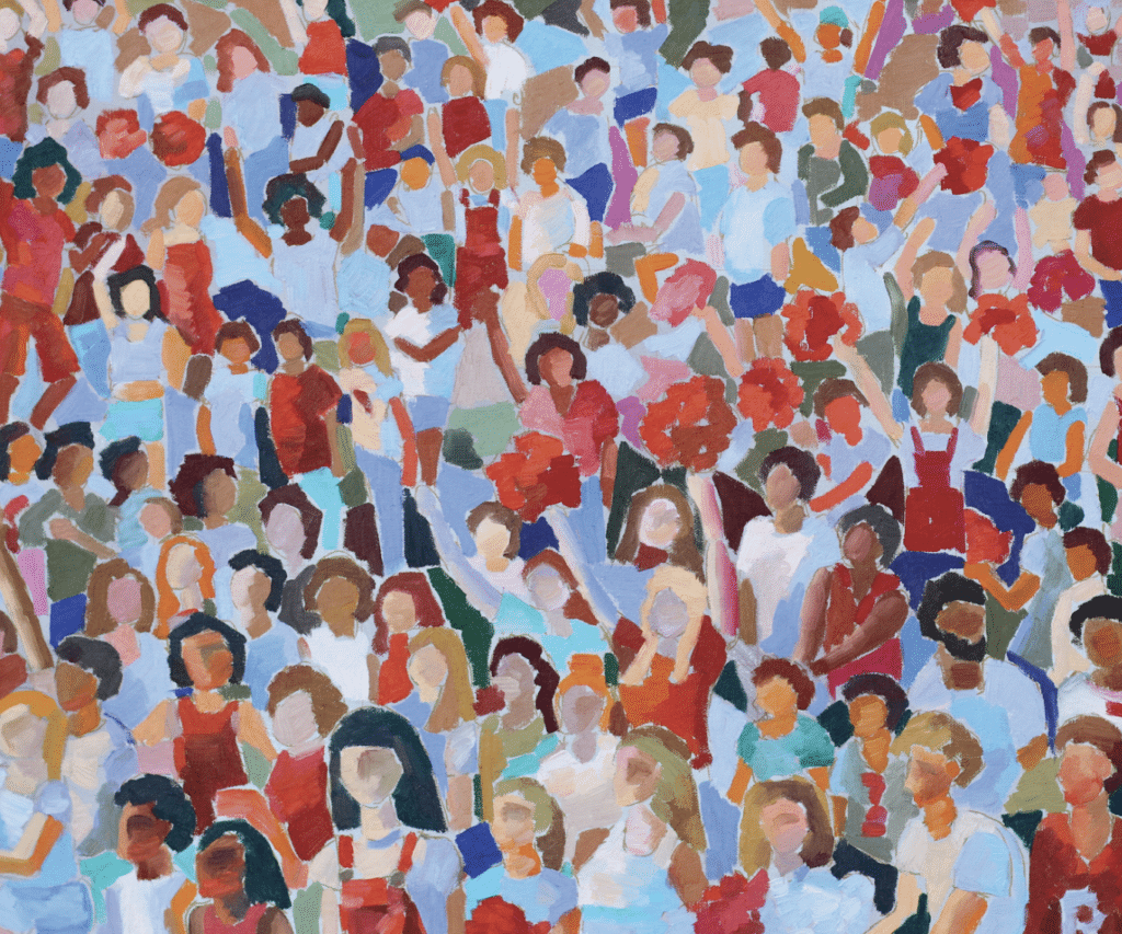 “Currently, my paintings focus on the nature of community – the dynamic relationships between different personas and how these interactions tell a story. I combine elements from several painting styles to make something entirely new. I use the tilted perspectives and puzzle of shapes in Abstraction to create dynamic compositions. Then I employ the bright tones and thickly textured brushwork of Impressionism to create movement within the forms. Lastly, I strive for the quirky imperfections of Folk Art to let each painting tell a story. This intersection of styles result in a wild combination of distinct characters set within our contemporary local moment celebrating togetherness, difference, and whimsicality.”